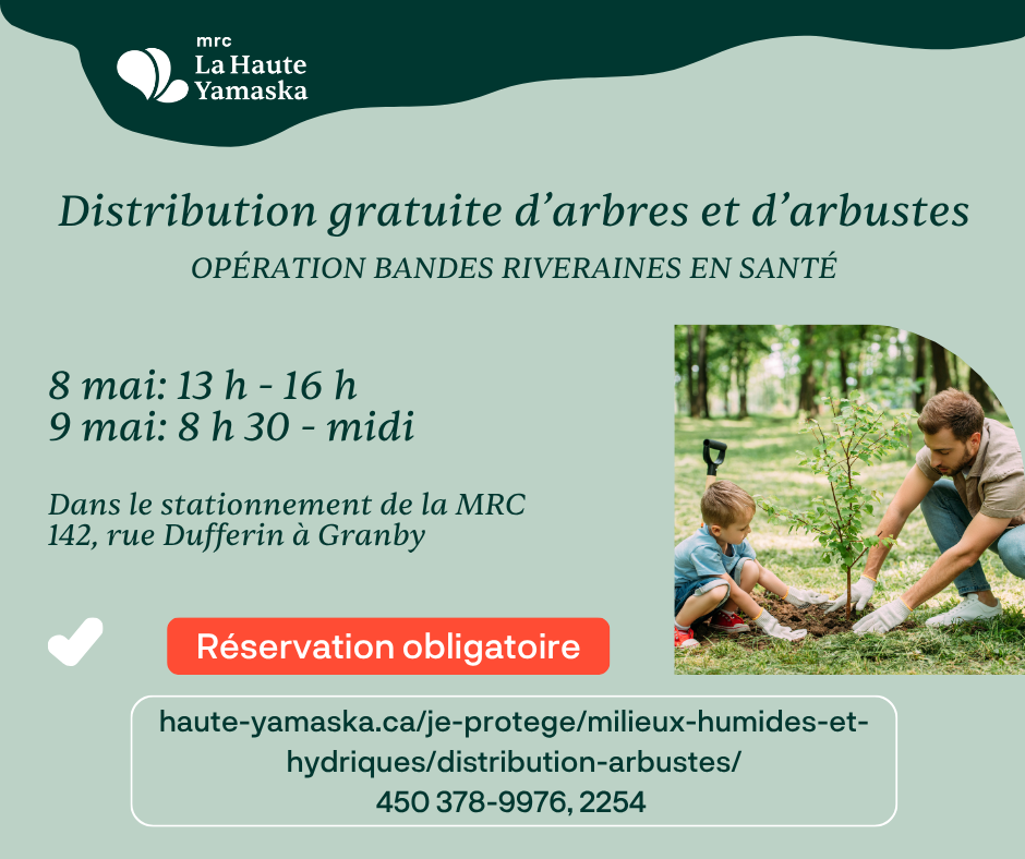 La distribution annuelle d’arbustes et d’arbres de la MRC est de retour pour propriétaires riverains de La Haute-Yamaska! La...